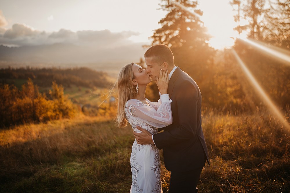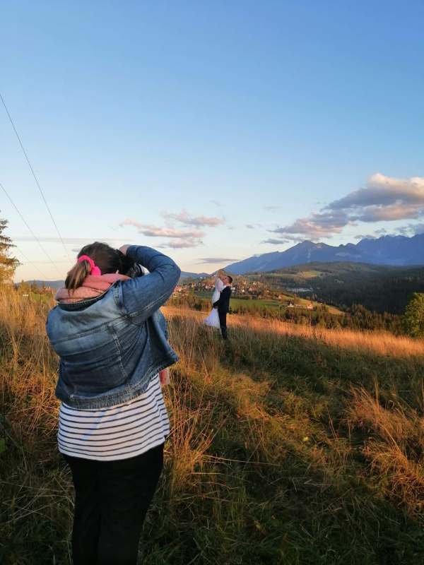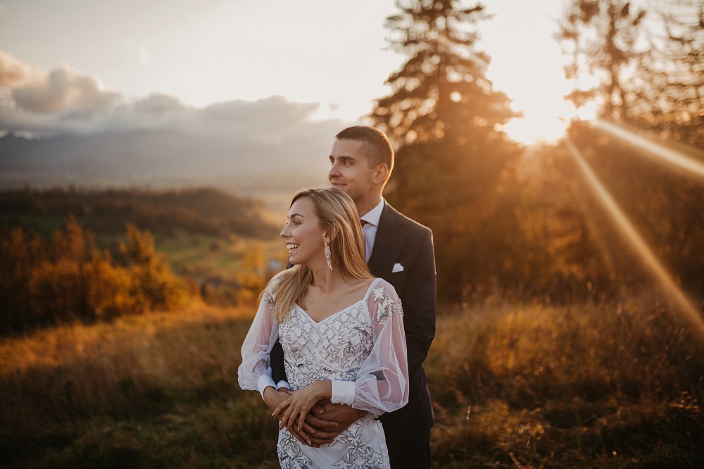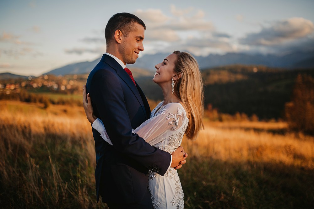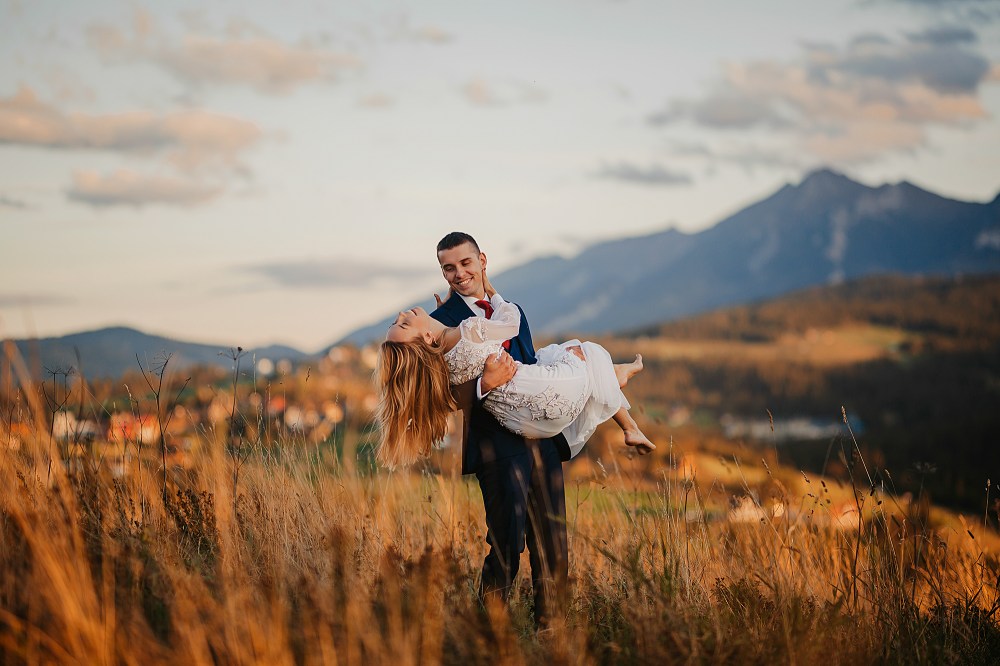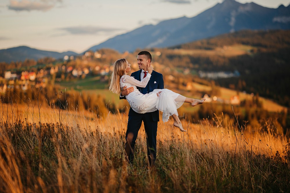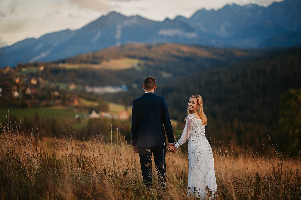 Następny dzień był naszym ostatnim pełnym w górach, ale postanowiliśmy spędzić go na luzie – wyspać się, trochę odpocząć, pójść na spacer. Pogoda znów była przepiękna, więc mimo, że mieliśmy już z 800 zdjęć, postanowiliśmy zrobić trzecią serię, tym razem w innej sukni Dominiki, którą zmieniała na ślubie po północy. Najpierw jednak zjedliśmy obiad w pięknej karczmie z widokiem na całe pasmo Tatr. To miejsce jest moim ulubionym w Bukowinie i najbliższych okolicach. Spędziłam tam wiele godzin, spacerując, robiąc zdjęcia, podziwiając widoki. Tym razem przyniosło nam szczęście, bo mimo wyjątkowości wszystkich zdjęć z naszego wyjazdu, te są moimi ulubionymi. Światło zagrało nam wprost idealnie, góry prezentowały się w pełnej okazałości, a Domcia i Robert pozowali już na zupełnym luzie. Ja zresztą też fotografowałam bez większej spiny, bo wiedziałam, ile już mamy materiału. Dlatego te ujęcia wyszły takie wyjątkowe!