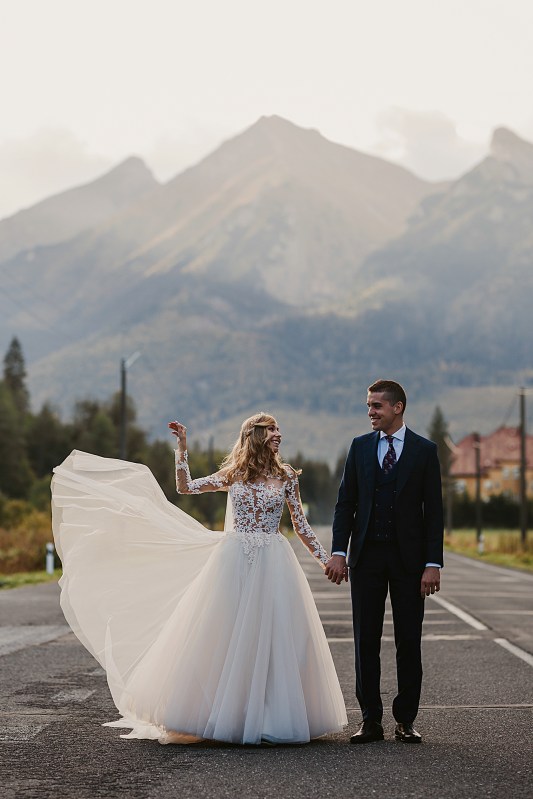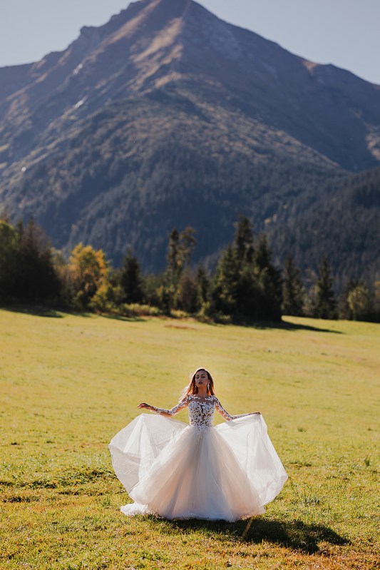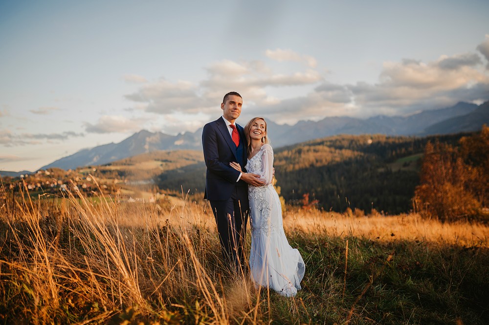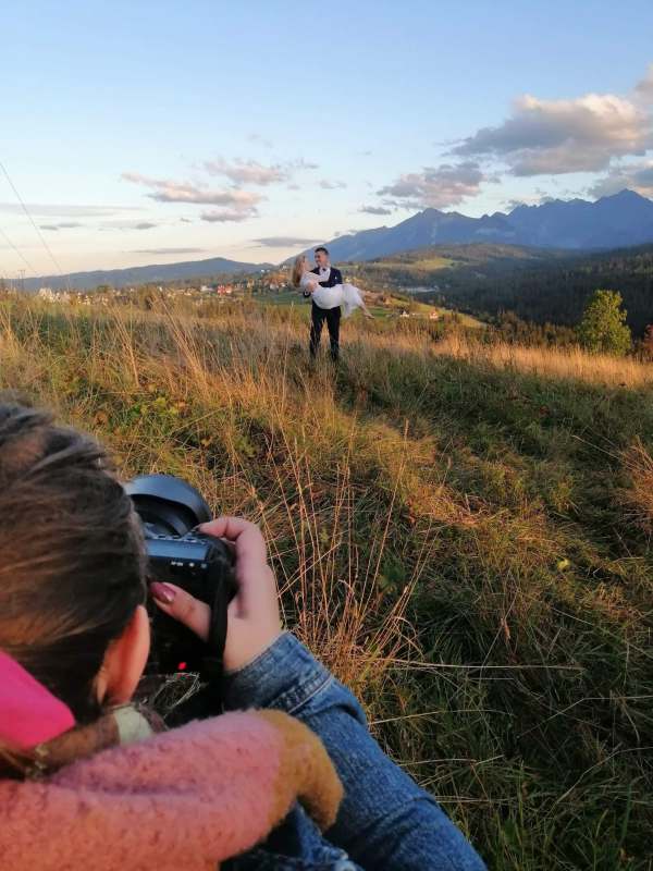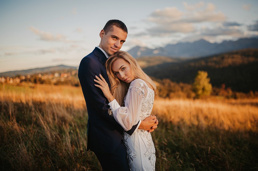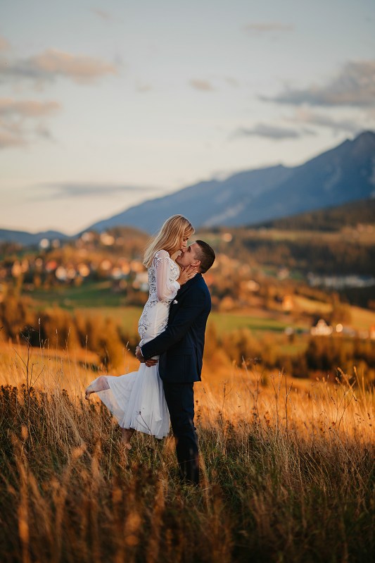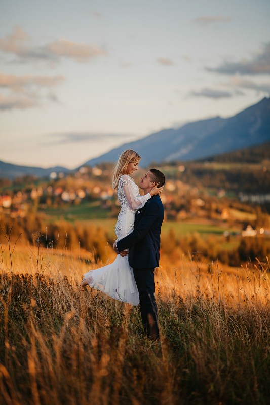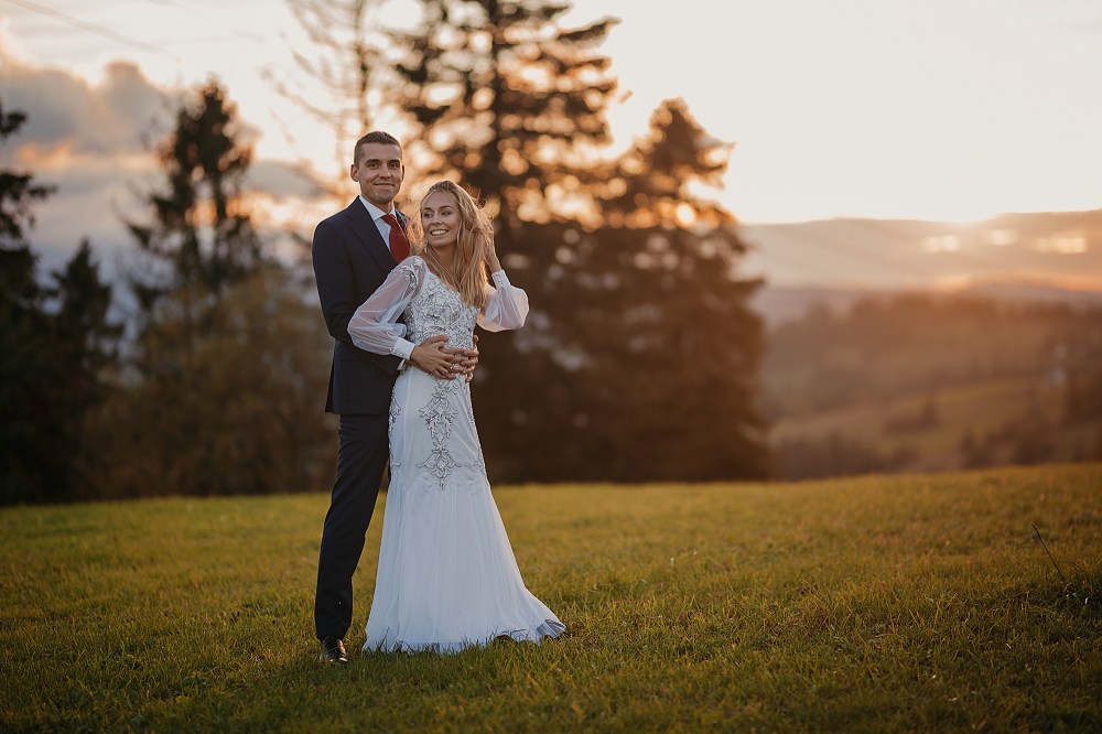 Następny dzień był naszym ostatnim pełnym w górach, ale postanowiliśmy spędzić go na luzie – wyspać się, trochę odpocząć, pójść na spacer. Pogoda znów była przepiękna, więc mimo, że mieliśmy już z 800 zdjęć, postanowiliśmy zrobić trzecią serię, tym razem w innej sukni Dominiki, którą zmieniała na ślubie po północy. Najpierw jednak zjedliśmy obiad w pięknej karczmie z widokiem na całe pasmo Tatr. To miejsce jest moim ulubionym w Bukowinie i najbliższych okolicach. Spędziłam tam wiele godzin, spacerując, robiąc zdjęcia, podziwiając widoki. Tym razem przyniosło nam szczęście, bo mimo wyjątkowości wszystkich zdjęć z naszego wyjazdu, te są moimi ulubionymi. Światło zagrało nam wprost idealnie, góry prezentowały się w pełnej okazałości, a Domcia i Robert pozowali już na zupełnym luzie. Ja zresztą też fotografowałam bez większej spiny, bo wiedziałam, ile już mamy materiału. Dlatego te ujęcia wyszły takie wyjątkowe!