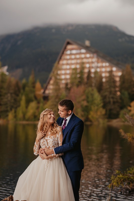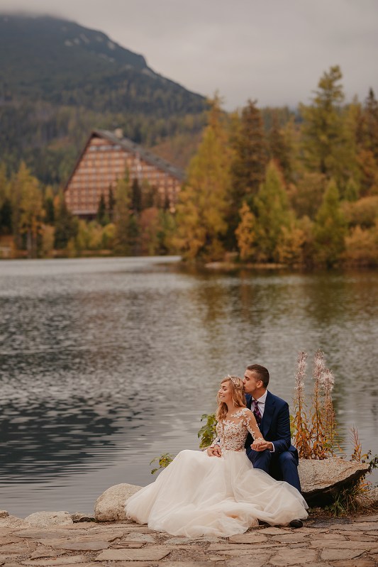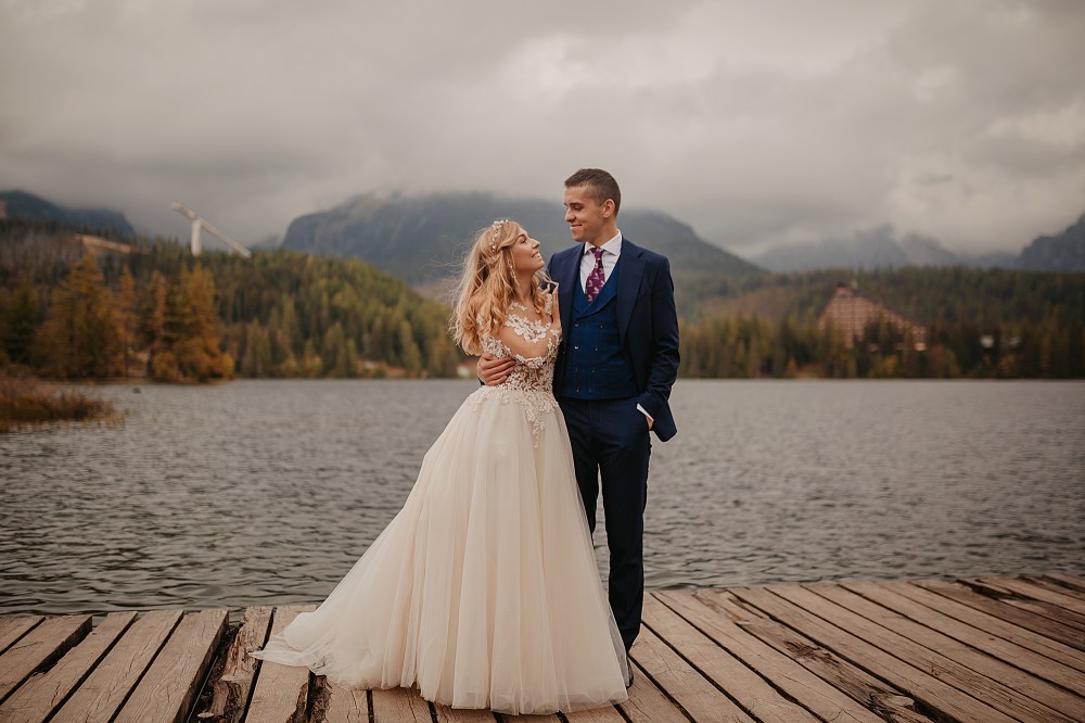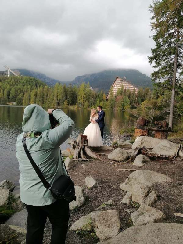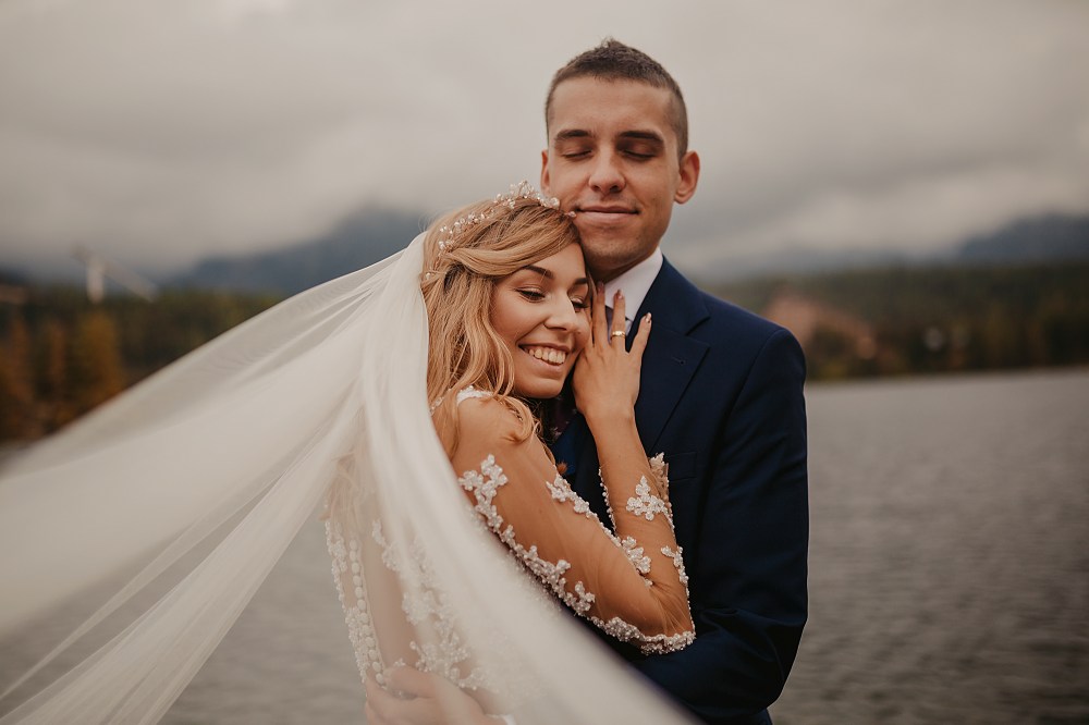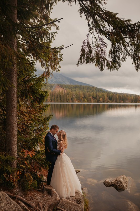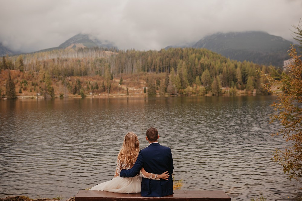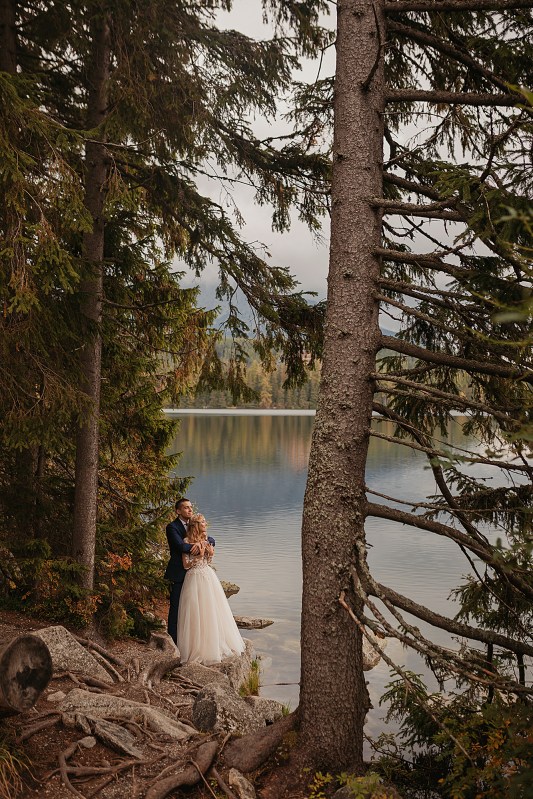 Kolejny dzień miał być TYM DNIEM, kiedy wejdziemy na Dolinę Pięciu Stawów. Pogoda w górach była jednak niepewna. Zapowiadano popołudniowe burze, opady. My nie byliśmy zbyt wytrawnymi piechurami górskimi (zwłaszcza ja :D preferuję góry zimą do jazdy na snowboardzie), a wejście jednak dość długim szlakiem ze sprzętem, suknią, garniturem, przy niepewnej pogodzie… Jednogłośnie odpuściliśmy ten pomysł. Na szczęście miałam plan B, czyli Szczyrbskie Jezioro. Dominika od razu podchwyciła pomysł, bo miejsce na zdjęciach wyglądało naprawdę pięknie. Z samego rana zapakowaliśmy więc prowiant i ruszyliśmy na wycieczkę przez cudowne słowackie Tatry Wysokie. Zrobiliśmy krótki przystanek na kilka zdjęć w klasycznym miejscu, czyli na przejściu granicznym. Sama podróż była bardzo piękna, przejeżdżaliśmy przez mnóstwo małych, klimatycznych wioseczek, a górskie widoki zapierały dech w piersiach. Gdy dotarliśmy na miejsce, pogoda się załamała, a z nią Dominika. Zaczął siąpić deszcz, ja jednak nie wątpiłam, że to chwilowe i pocieszałam ją jak mogłam. Na szczęście miałam rację i po krótkim oczekiwaniu deszcz przestał padać i trochę się rozchmurzyło (i Dominika też). Niestety nie doświadczyliśmy tego dnia pięknego słońca na zdjęciach, ale takie przychmurzone góry też mają swój urok :) Obeszliśmy jezioro dookoła, słuchając przemiłych komentarzy Słowaków, a nawet Niemców! To był piękny spacer połączony z cudownymi zdjęciami. Wracaliśmy do Polski w świetnym nastroju i okazało się, że niżej pogoda jest bardzo ładna! Poszliśmy zjeść do góralskiej knajpki, a wieczorem wybieraliśmy zdjęcia przy nalewce ze ślubu :)