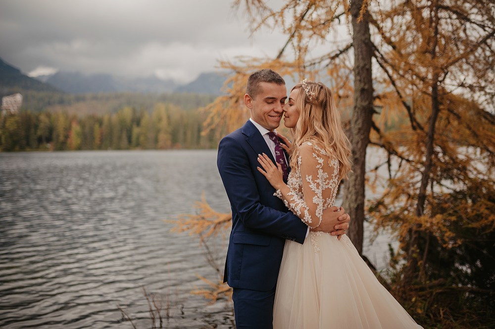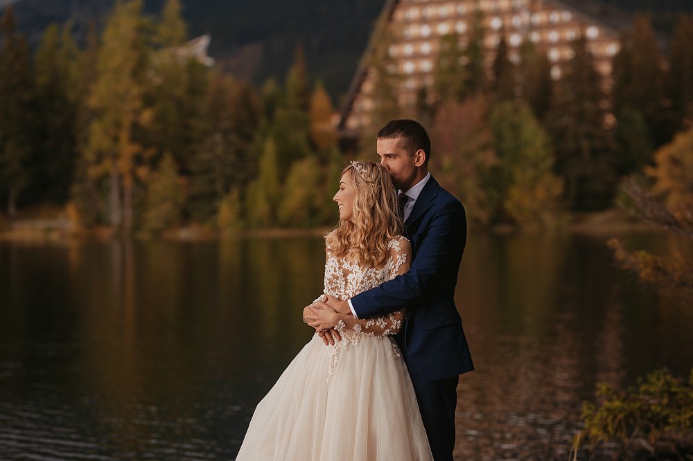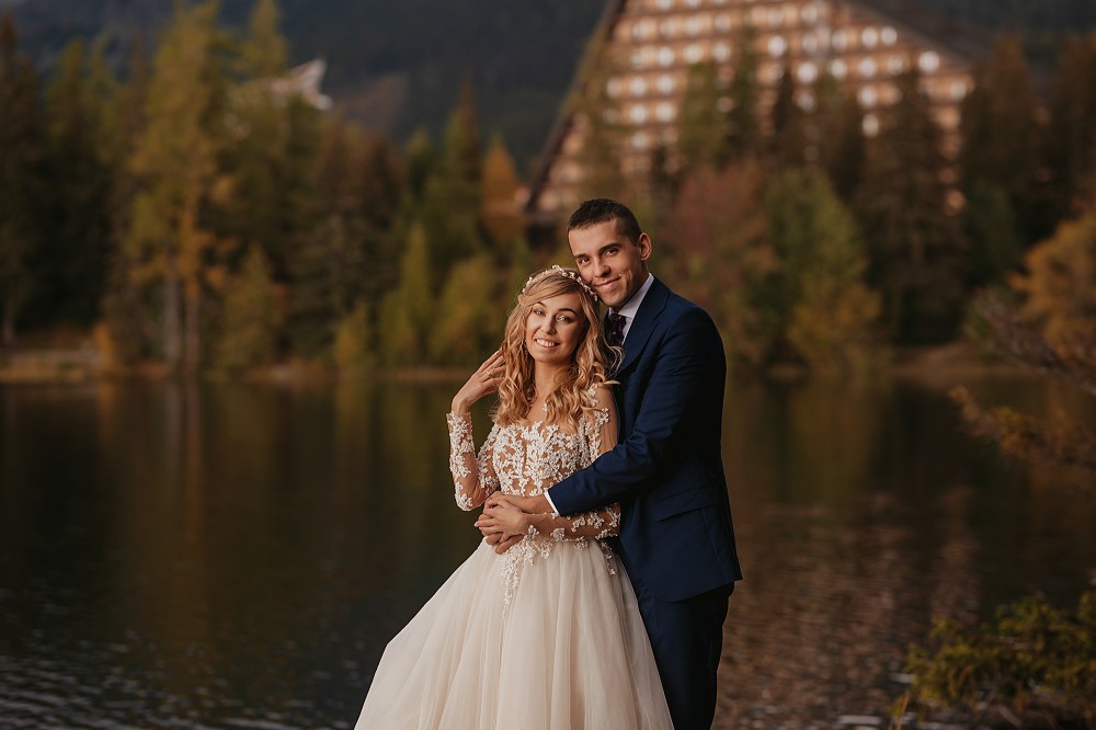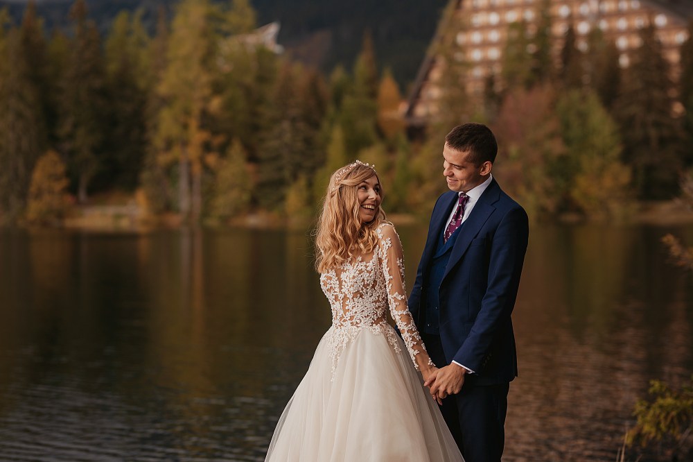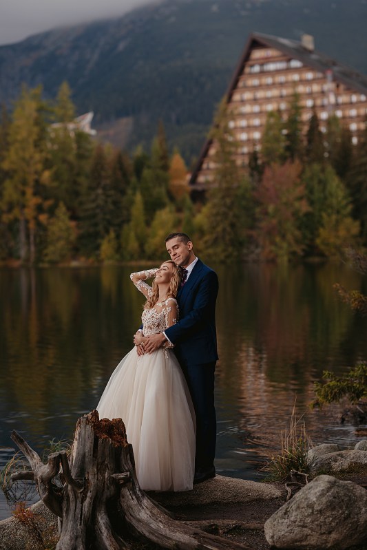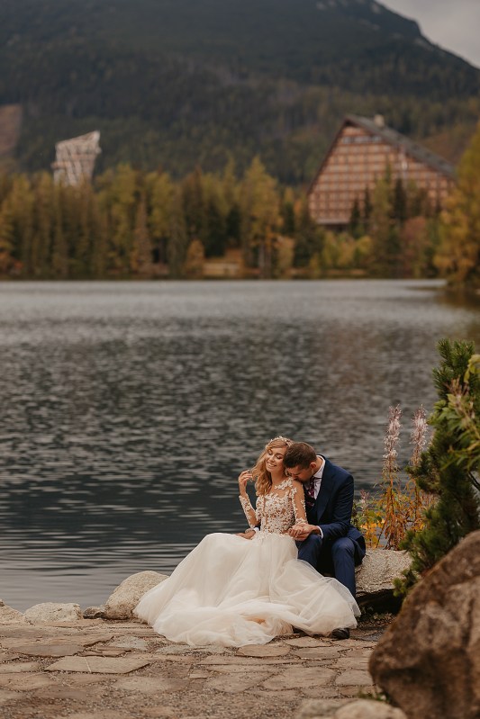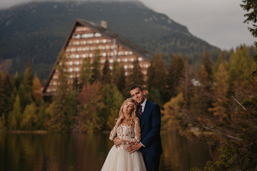 Kolejny dzień miał być TYM DNIEM, kiedy wejdziemy na Dolinę Pięciu Stawów. Pogoda w górach była jednak niepewna. Zapowiadano popołudniowe burze, opady. My nie byliśmy zbyt wytrawnymi piechurami górskimi (zwłaszcza ja :D preferuję góry zimą do jazdy na snowboardzie), a wejście jednak dość długim szlakiem ze sprzętem, suknią, garniturem, przy niepewnej pogodzie… Jednogłośnie odpuściliśmy ten pomysł. Na szczęście miałam plan B, czyli Szczyrbskie Jezioro. Dominika od razu podchwyciła pomysł, bo miejsce na zdjęciach wyglądało naprawdę pięknie. Z samego rana zapakowaliśmy więc prowiant i ruszyliśmy na wycieczkę przez cudowne słowackie Tatry Wysokie. Zrobiliśmy krótki przystanek na kilka zdjęć w klasycznym miejscu, czyli na przejściu granicznym. Sama podróż była bardzo piękna, przejeżdżaliśmy przez mnóstwo małych, klimatycznych wioseczek, a górskie widoki zapierały dech w piersiach. Gdy dotarliśmy na miejsce, pogoda się załamała, a z nią Dominika. Zaczął siąpić deszcz, ja jednak nie wątpiłam, że to chwilowe i pocieszałam ją jak mogłam. Na szczęście miałam rację i po krótkim oczekiwaniu deszcz przestał padać i trochę się rozchmurzyło (i Dominika też). Niestety nie doświadczyliśmy tego dnia pięknego słońca na zdjęciach, ale takie przychmurzone góry też mają swój urok :) Obeszliśmy jezioro dookoła, słuchając przemiłych komentarzy Słowaków, a nawet Niemców! To był piękny spacer połączony z cudownymi zdjęciami. Wracaliśmy do Polski w świetnym nastroju i okazało się, że niżej pogoda jest bardzo ładna! Poszliśmy zjeść do góralskiej knajpki, a wieczorem wybieraliśmy zdjęcia przy nalewce ze ślubu :)