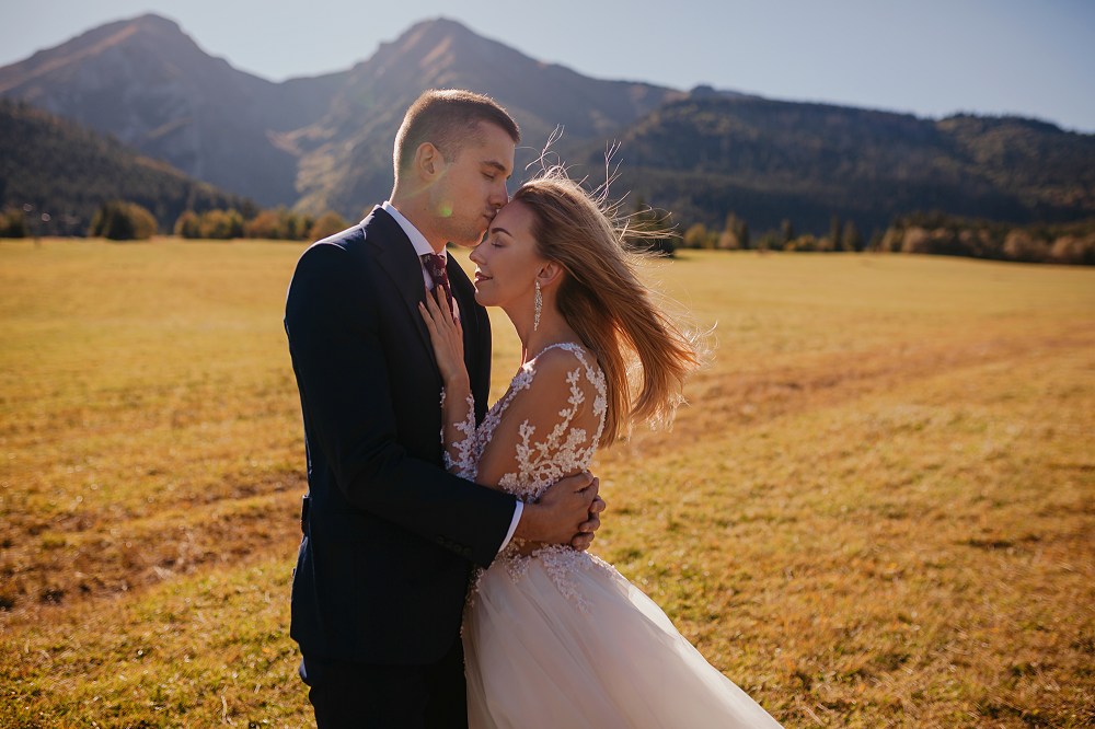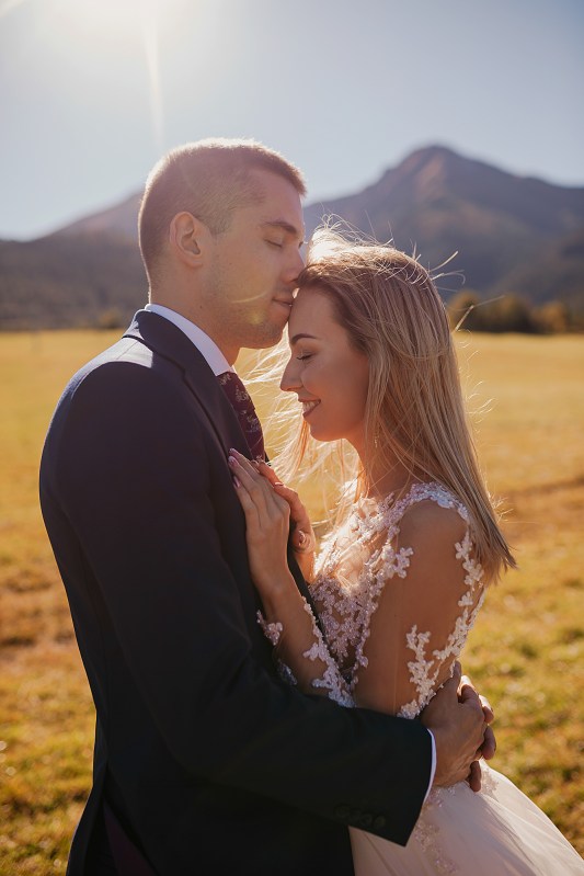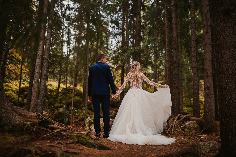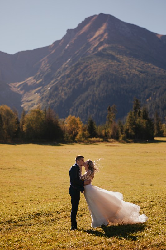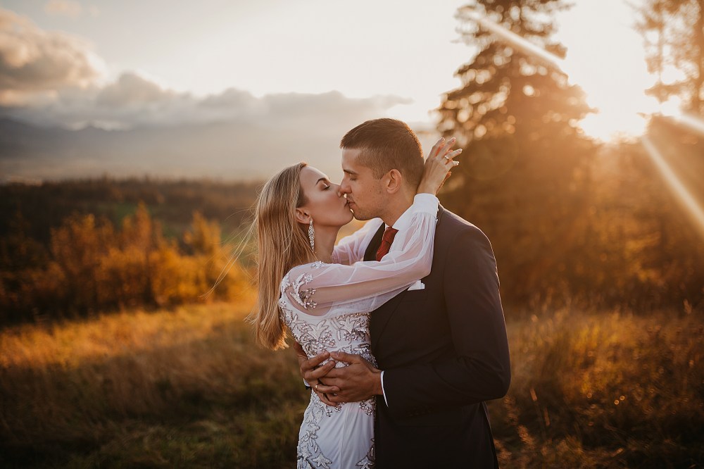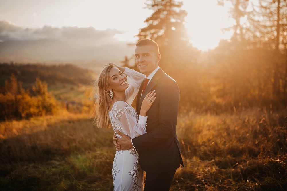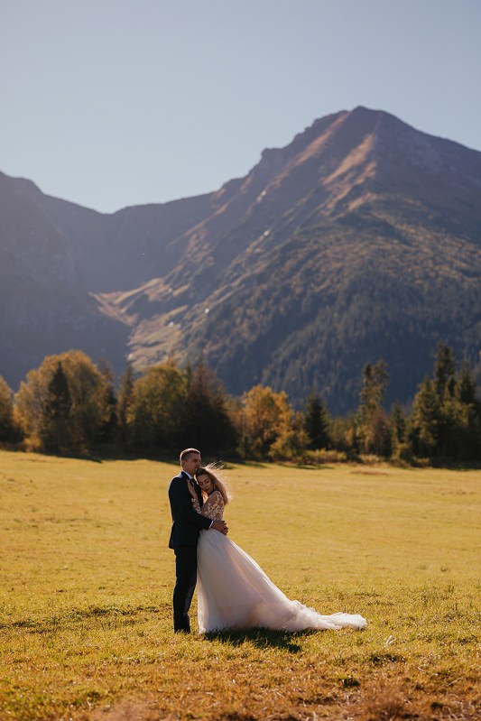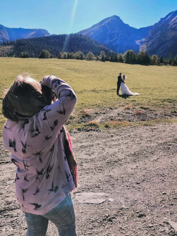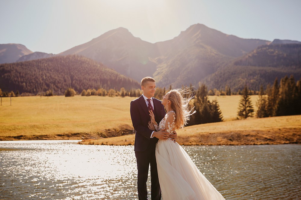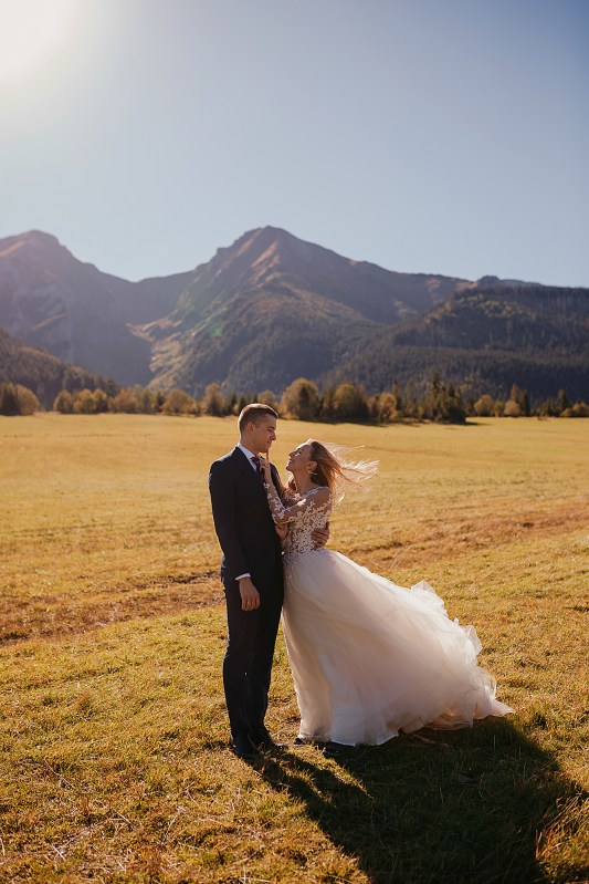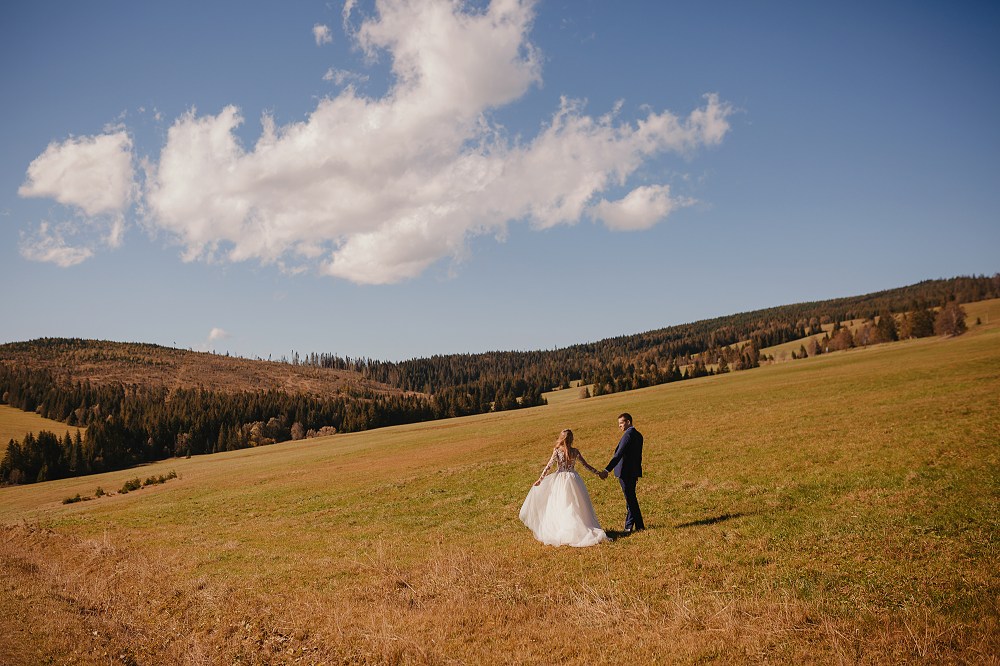 Ślub Dominiki i Roberta był cudownym wydarzeniem, na które czekałam od wielu miesięcy! Bardzo wzruszał mnie fakt, że z Domcią poznałam się tyle lat wcześniej na sesji zdjęciowej, a teraz będę płakać na jej ślubie. Od początku też było ustalone, że w ramach „podróży poślubnej” ;) pojedziemy we czwórkę do mojej ukochanej Bukowiny Tatrzańskiej i zrobimy plener ślubny w górach. Byłam bardzo tym podekscytowana, bo nigdy nie robiłam ślubnej sesji w Tatrach. Postanowiliśmy, że wejdziemy na Dolinę Pięciu Stawów, gdzie Robert oświadczył się Dominice i tam wykonamy nasze zdjęcia. W międzyczasie jednak wiele się zmieniało. Wirus szalał, pogoda była wielką niewiadomą (w końcu początek października!), zupełnie nie wiedzieliśmy, co to będzie. Postanowiłam więc pomyśleć nad ewentualnym planem B i zrobiłam research wśród znajomych i w internecie, gdzie jeszcze moglibyśmy zrobić piękne ujęcia. Jechaliśmy więc do Bukowiny raczej spokojni, że na pewno któryś plan nam się powiedzie. Na miejscu przywitała nas piękna, wczesnojesienna pogoda. Słońce świeciło od pierwszego dnia, a my uznaliśmy, że po ciężkiej podróży nie będziemy z samego rana ruszać na szlak, a podjedziemy na Słowację. Na szczęście granice były jeszcze otwarte, więc ruszyliśmy do Zdziaru. Piękna miejscowość nieopodal granicy, z cudownymi widokami na Tatry Wysokie. Pogoda była wspaniała, choć bardzo wiało. Mieliśmy jednak mnóstwo funu i zrobiliśmy piękne kadry! Z radością wracaliśmy do Polski na góralskie jedzonko, nalewkę i zasłużony odpoczynek :)