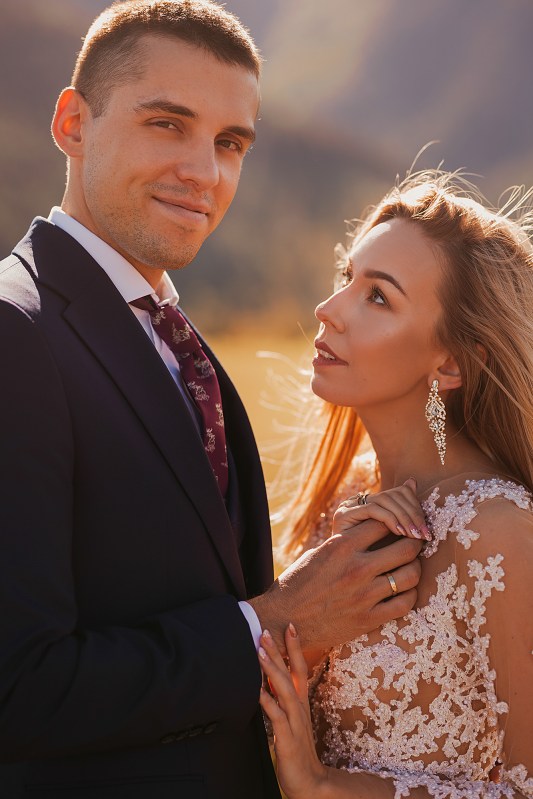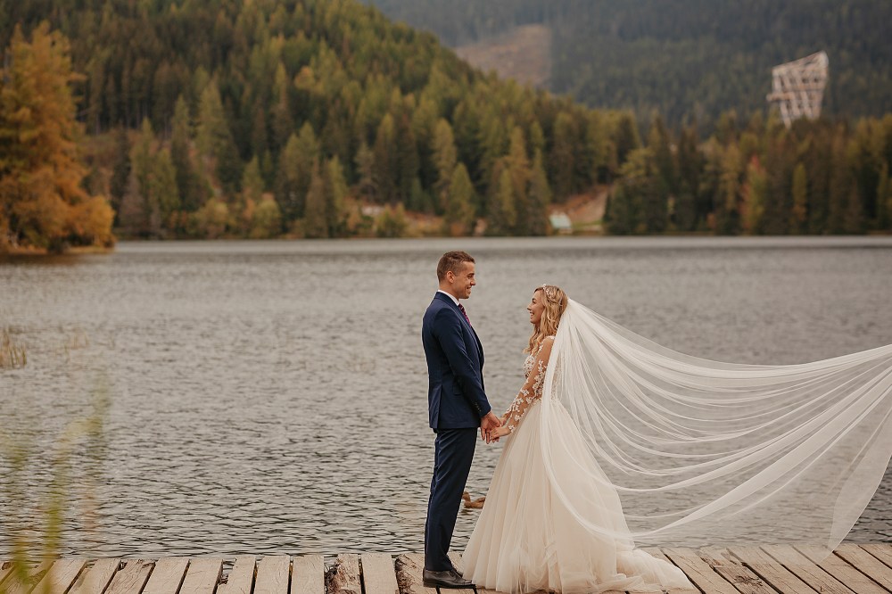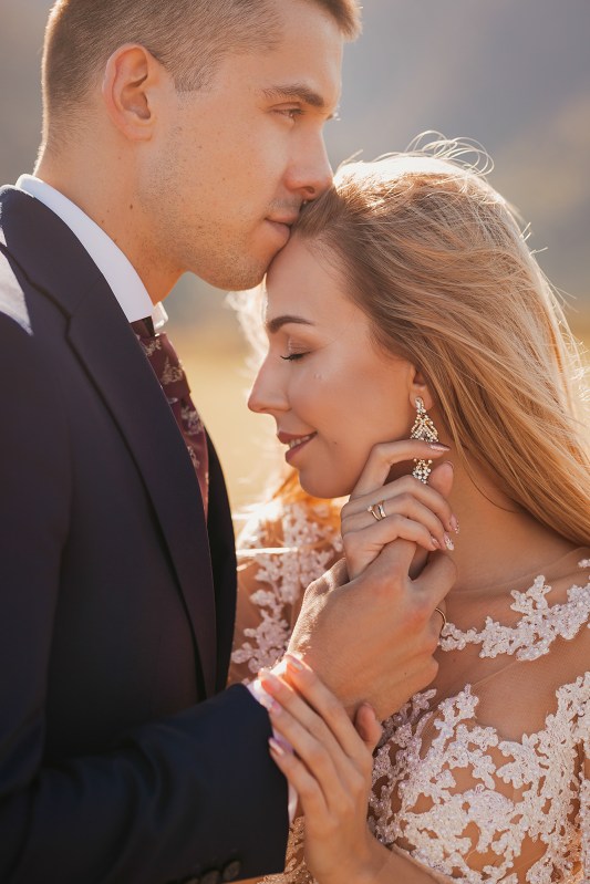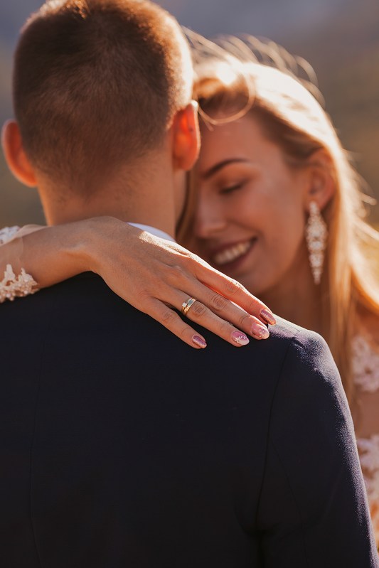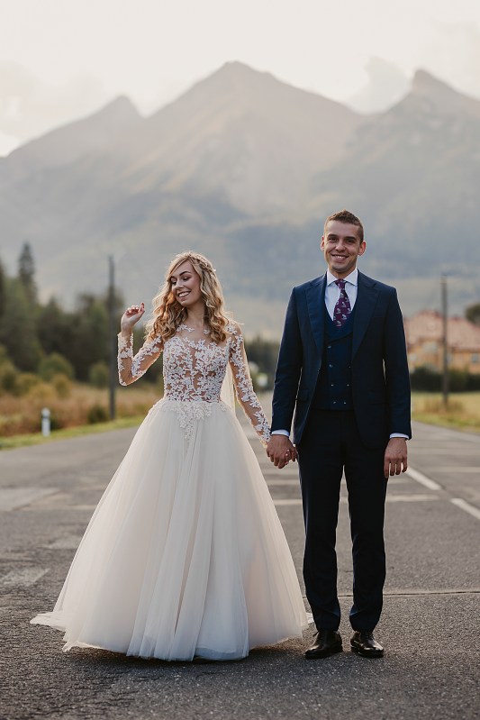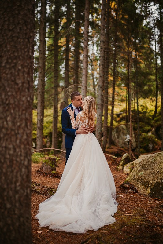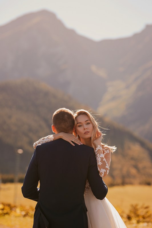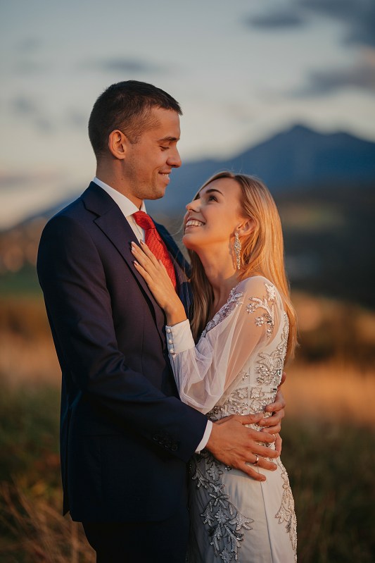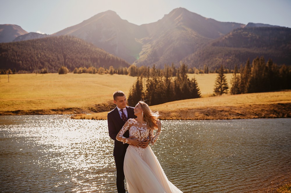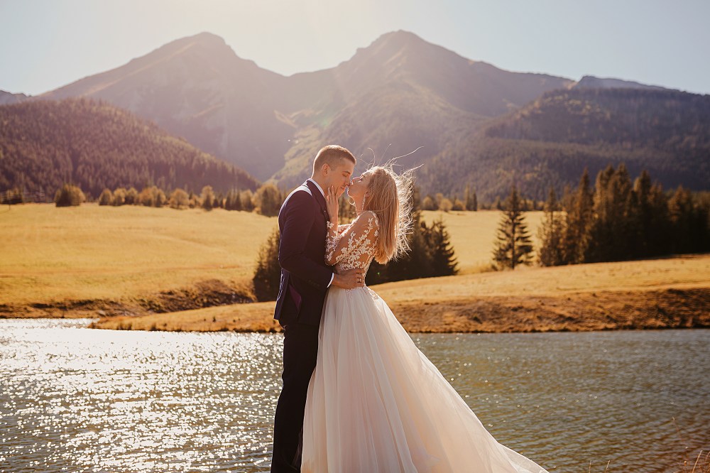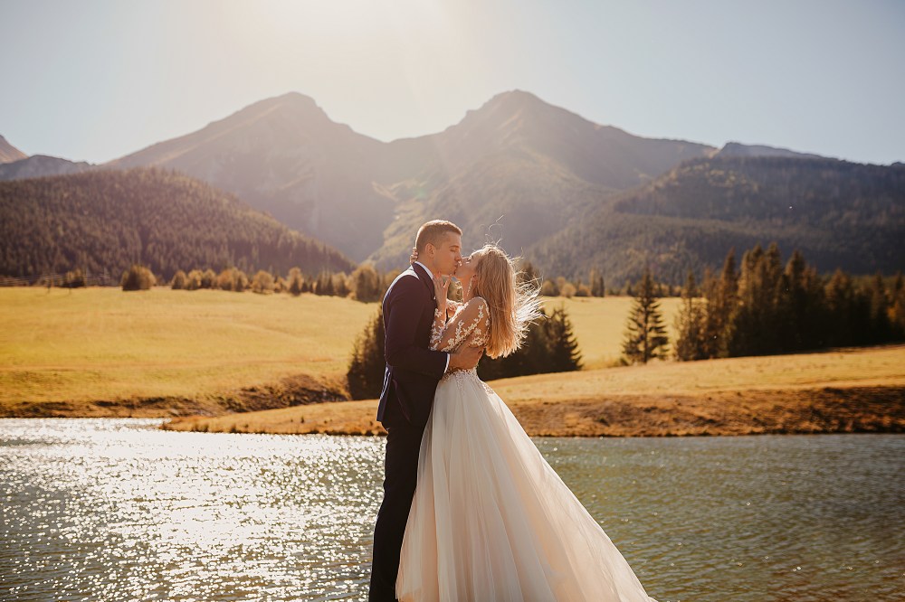 Ślub Dominiki i Roberta był cudownym wydarzeniem, na które czekałam od wielu miesięcy! Bardzo wzruszał mnie fakt, że z Domcią poznałam się tyle lat wcześniej na sesji zdjęciowej, a teraz będę płakać na jej ślubie. Od początku też było ustalone, że w ramach „podróży poślubnej” ;) pojedziemy we czwórkę do mojej ukochanej Bukowiny Tatrzańskiej i zrobimy plener ślubny w górach. Byłam bardzo tym podekscytowana, bo nigdy nie robiłam ślubnej sesji w Tatrach. Postanowiliśmy, że wejdziemy na Dolinę Pięciu Stawów, gdzie Robert oświadczył się Dominice i tam wykonamy nasze zdjęcia. W międzyczasie jednak wiele się zmieniało. Wirus szalał, pogoda była wielką niewiadomą (w końcu początek października!), zupełnie nie wiedzieliśmy, co to będzie. Postanowiłam więc pomyśleć nad ewentualnym planem B i zrobiłam research wśród znajomych i w internecie, gdzie jeszcze moglibyśmy zrobić piękne ujęcia. Jechaliśmy więc do Bukowiny raczej spokojni, że na pewno któryś plan nam się powiedzie. Na miejscu przywitała nas piękna, wczesnojesienna pogoda. Słońce świeciło od pierwszego dnia, a my uznaliśmy, że po ciężkiej podróży nie będziemy z samego rana ruszać na szlak, a podjedziemy na Słowację. Na szczęście granice były jeszcze otwarte, więc ruszyliśmy do Zdziaru. Piękna miejscowość nieopodal granicy, z cudownymi widokami na Tatry Wysokie. Pogoda była wspaniała, choć bardzo wiało. Mieliśmy jednak mnóstwo funu i zrobiliśmy piękne kadry! Z radością wracaliśmy do Polski na góralskie jedzonko, nalewkę i zasłużony odpoczynek :)