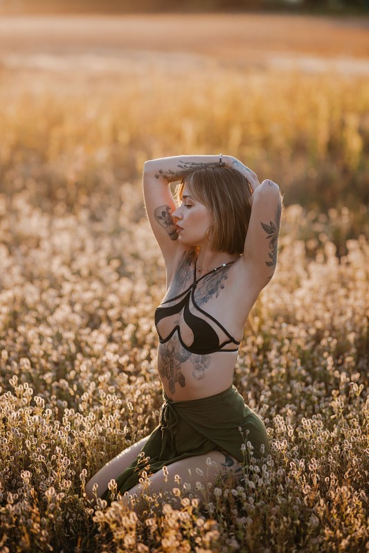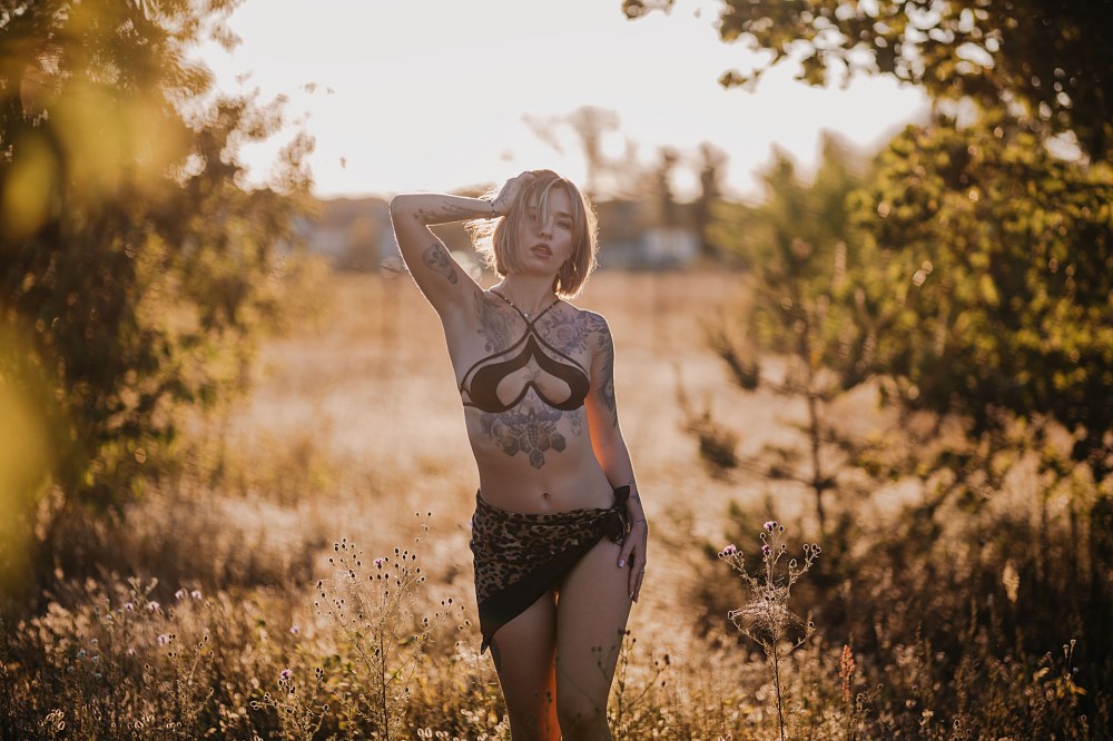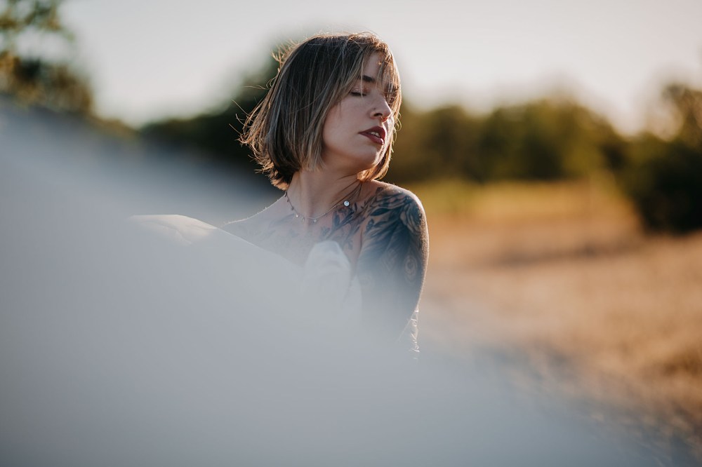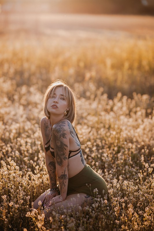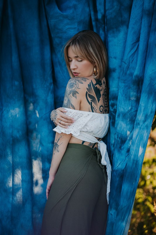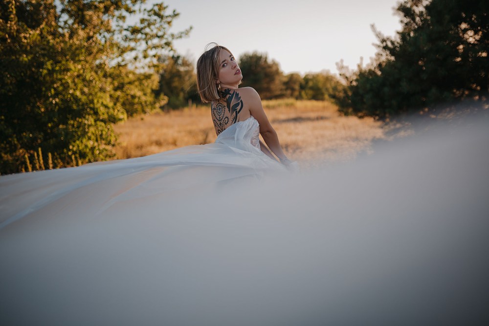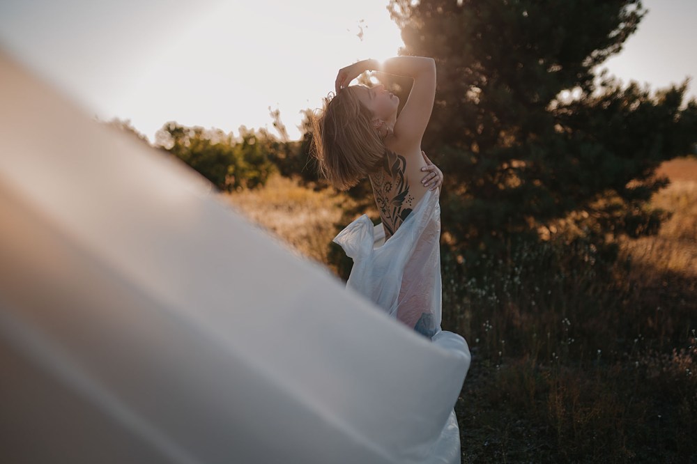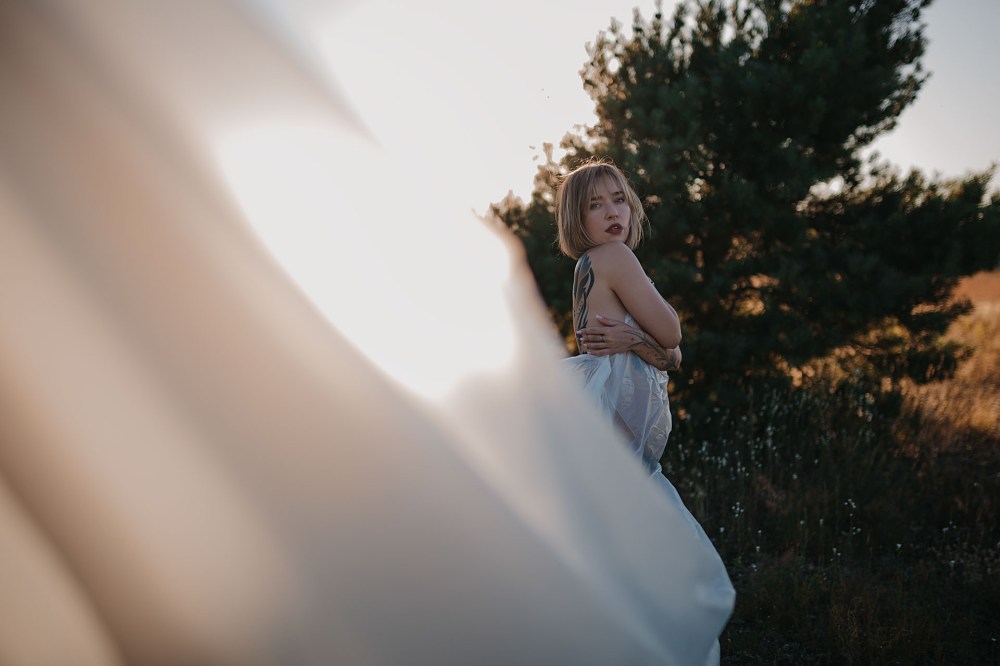 Pomysł na sesję był taki, aby rozstawić w plenerze tło, potem zrobić ujęcia z folią malarską i jakieś „zwykłe” fotki na łące z zachodem słońca. Niestety statyw z tłem cały czas się nam przewracał, więc wyszło z nim dosłownie kilka zdjęć. Folia malarska to jednak problematyczny atrybut do zdjęć i zdecydowanie wymaga asystenta 😄 Ale dajcie znać, co myślicie o tych ujęciach, mimo ich niedoskonałości.